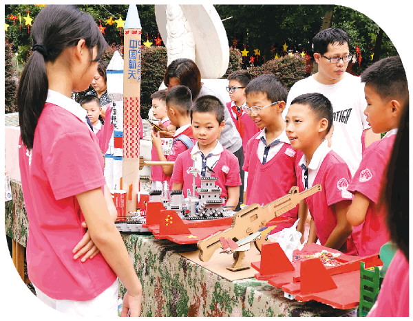 市卓然学校的孩子们正在观看“我的强国梦”手工作品展。