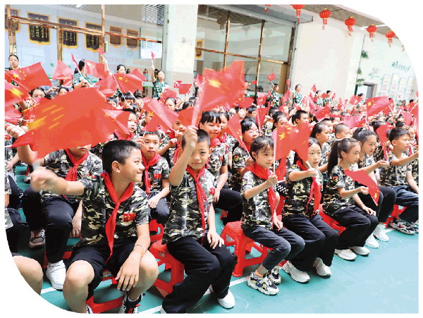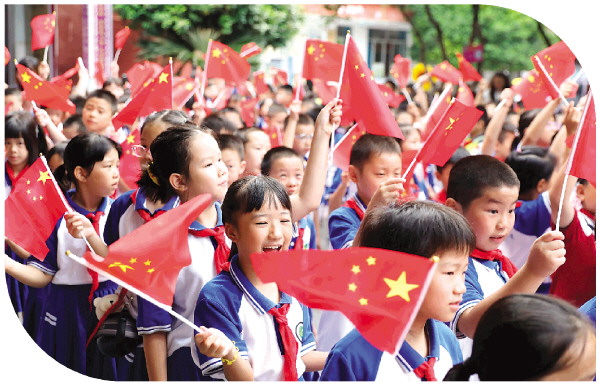 市育才小学的孩子们挥舞着国旗齐唱红歌。