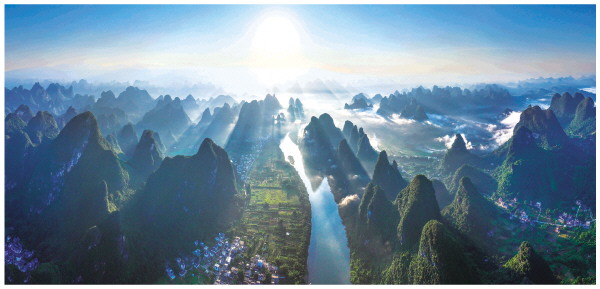 ◥8月28日清晨7时,朝阳的光路从喀斯特峰林之间倾泻而出,云雾退作柔纱,碧水浮光跃金,山峦的缝隙成了天地交接的镜廊。在漓江的晨曦中,我们能看见光如何用脚步丈量山水的高度。
