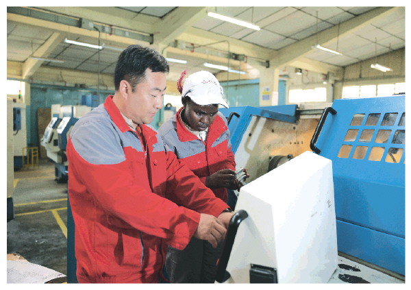 ▲8月29日,在位于肯尼亚首都内罗毕的肯尼亚科技大学,中方指导老师与第十届非洲职业技能挑战赛的参赛选手在数控车床前交流。