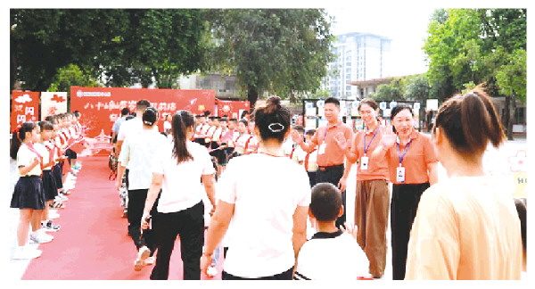 学校领导和学生代表热烈欢迎新生入校(桂林市跃进中心校供图)