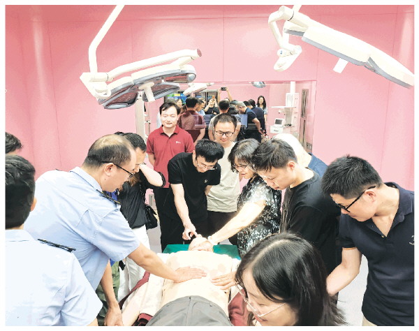 活动中,参观代表对测试研究平台的高端全功能医疗模拟人十分感兴趣,纷纷驻足拍照、触摸。 记者张苑 摄