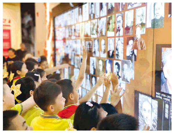 孩子们正点击屏幕上的抗战文化名人头像,了解他们的生平故事。 记者韦莎妮娜 摄