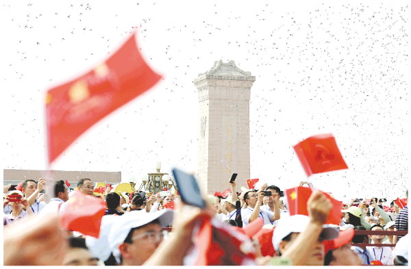 9月3日,习近平总书记同来自五大洲的外国友人并肩站立在天安门城楼上。26架直升机组成巨大的“80”字样飞过,众人仰首凝望。