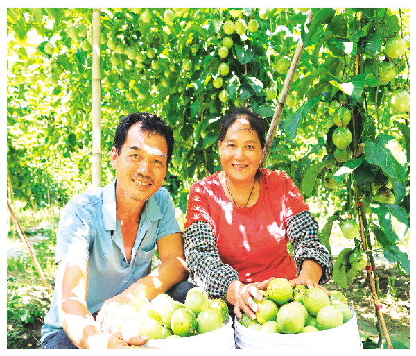 灵川县的百香果种植户喜迎丰收,笑容满面。王道梅 摄