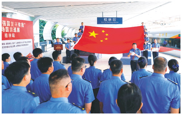 桂林铁路干部职工以及铁路公安人员来到桂林站1号站台,面对国旗庄严宣誓。
