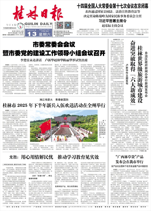 本报南宁讯(记者李云波)9月12日,广西壮族自治区人民政府新闻办公室举行“高质量完成‘十四五’规划”系列主题新闻发布会,介绍桂林市全力以赴推动世界级旅游城市建设有关情况。桂林市委副书记、市长卢新华就生态保护、文旅焕新、科创赋能、品质提升、强县富民、开放合作等六个方面取得的“六大新成效”作主题发布并回答记者提问。