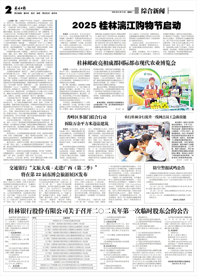 (上接第一版)三是赋予千行百业“科技范”。桂林坚持有所为、有所不为,充分发挥高校、科研院所和人才等比较优势,主动融入中国—东盟人工智能创新合作中心建设,加快建设“科创桂林”,打造科创广西先行试验区。主动用人工智能创新文旅“新玩法”,漓江磨盘山码头“AI文创旧报纸拍摄机”,让游客瞬间穿越时光隧道;象山景区AI机器人把桂林山水“画”进咖啡里;与人民网合作开发、旨在推动文旅产业智能化变革的“AI桂林”文旅大模型即将在第22届中国—东盟博览会(以下简称本届东博会)期间正式亮相。积极将人工智能应用到各行各业,落地广西首个全国产化商用大模型“桂林版昇腾DeepSeek”、推出广西首个行政审批智能体“漓政通”,“智能医助”等50个人工智能开放场景、28家企业人工智能产品及场景入选2025年广西人工智能产品、垂直领域模型和“人工智能+制造”典型应用场景。桂林正以“人工智能+”为纽带,串联起千行百业的智能变革。