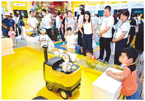 9月14日,观众在服贸会美团展台观看配送机器人。