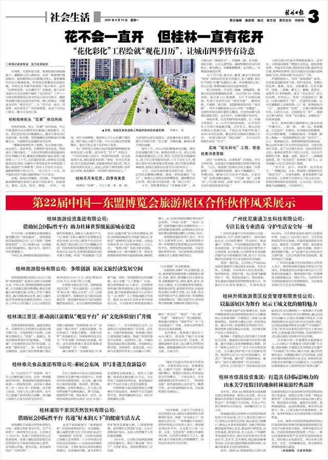 本报讯(记者李思静)第22届中国—东盟博览会旅游展区将于9月19日至21日在桂林国际会展中心开启。记者从中国—东盟博览会旅游展区筹委会秘书处了解到,位于桂林国际会展中心4号馆的桂林馆,展览面积为1200平方米,将以“AI赋能、文化传承,打造永不落幕的数字化桂林展厅”为主题,集聚近60家优质文旅企业,围绕低空装备、文旅科技、文化艺术、桂林有礼、非遗活态体验、户外运动与旅居、休闲食品七大板块联动呈现,全面展示桂林文旅产业创新发展成果。