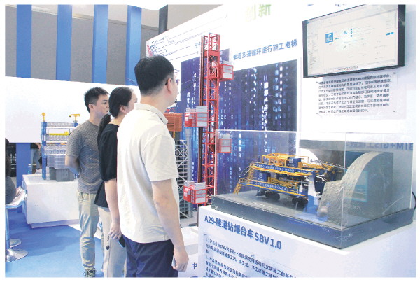 中国建筑展厅展示的隧道钻爆台车SBV1.0模型及数据处理平台吸引了市民游客驻足观看。