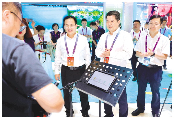 在广西师范大学出版社集团有限公司展区,李楚、卢新华现场体验了与西游记有关的沉浸式场景。李楚对企业的创新精神给予充分肯定,希望企业积极融入“科创桂林”建设,充分发挥高校科研、技术、人才优势,紧紧抓住人工智能时代机遇,进一步加大研发力度,打造更多“人工智能+”产品,主动融入中国—东盟人工智能创新合作中心建设,为打造科创广西先行试验区贡献力量。
