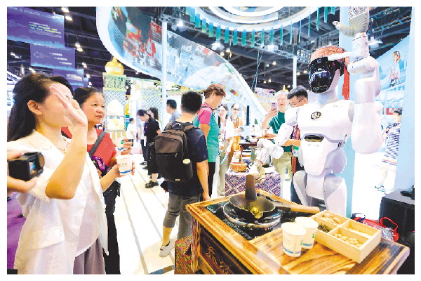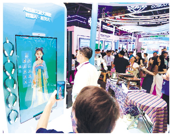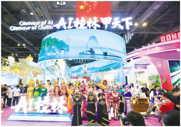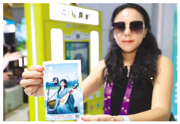 在桂林魅力之城展区,与AI有关的产品展示受到观众的热捧,排队体验的人络绎不绝。这是参观嘉宾展示她用AI写真机拍摄的与桂林山水的合影。