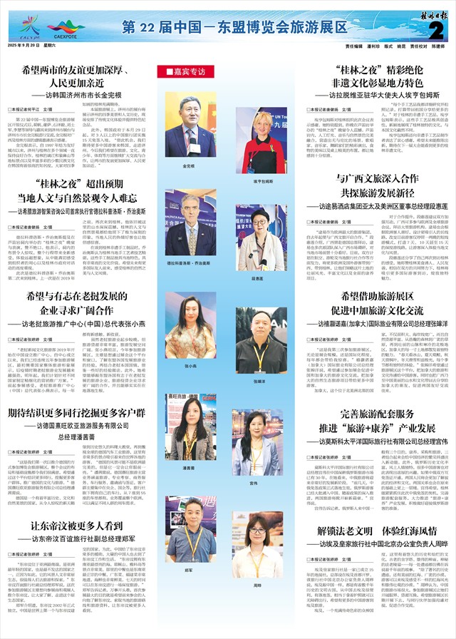 韩国济州市市长金完根等代表团成员一致感谢桂林方面的盛情邀请,祝贺第22届中国—东盟博览会旅游展区成功举办。大家表示,本届中国—东盟博览会旅游展区是通过旅游彰显国际团结与合作精神的盛会,意义重大。代表团成员期待各国分享旅游可持续发展的经验,共同探索交流与共赢之路,携手创造一个和平、幸福的美好世界。