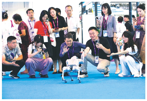 9月19日,在南宁国际会展中心,参观者观看机器狗表演。