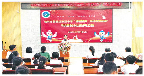 日前,临桂区致远小学开展了以“铸魂强师,共绘教育蓝图”为主题的师德师风演讲比赛。教师们结合育人实践,深情讲述以德立教、潜心育人的感人故事,充分展现了该校教师崇德向善、爱岗敬业的精神风貌与职业情怀。 记者文新军 摄