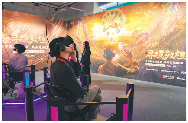 9月21日,在第八届丝绸之路(敦煌)国际文化博览会上,与会嘉宾借助VR设备沉浸式游览莫高窟虚拟场景。