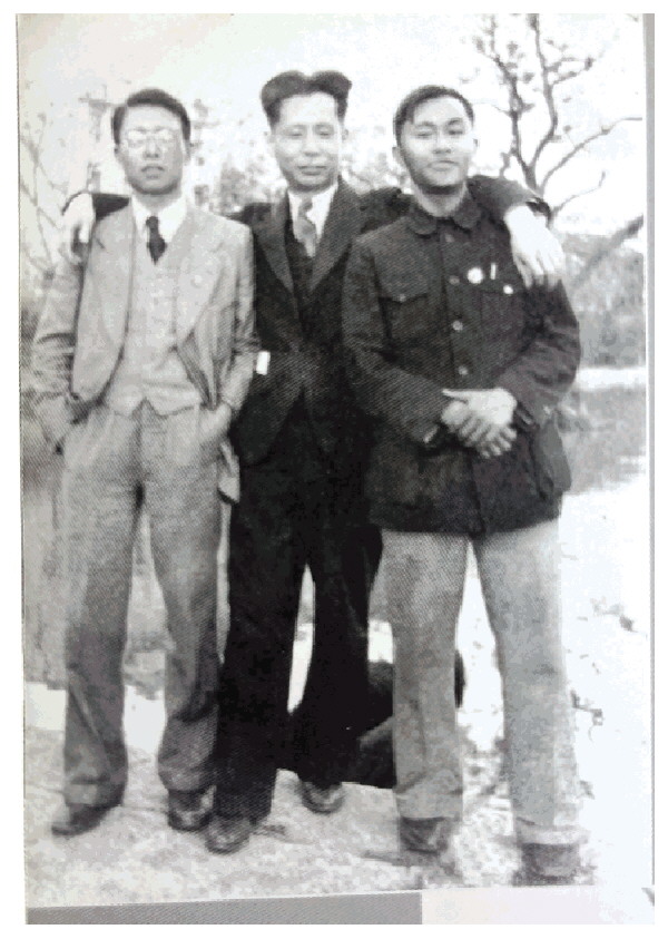 图④:1939年黄药眠(中)与国新社的两青年在桂林的合影。