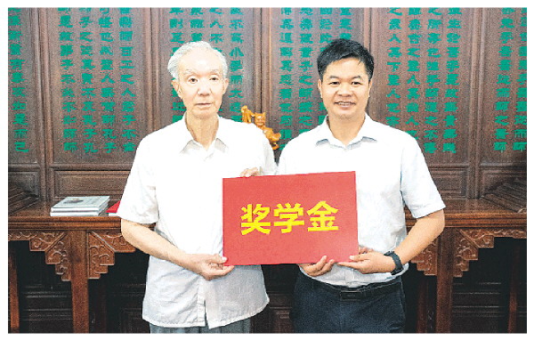 图④:中国科学院院士雷啸霖为母校捐赠奖学金。