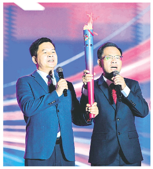 图①:桂林中学党委书记蒋向东、校长关剑锋从历任校领导手中接过火炬,寓意桂林中学的育人使命薪火相传。