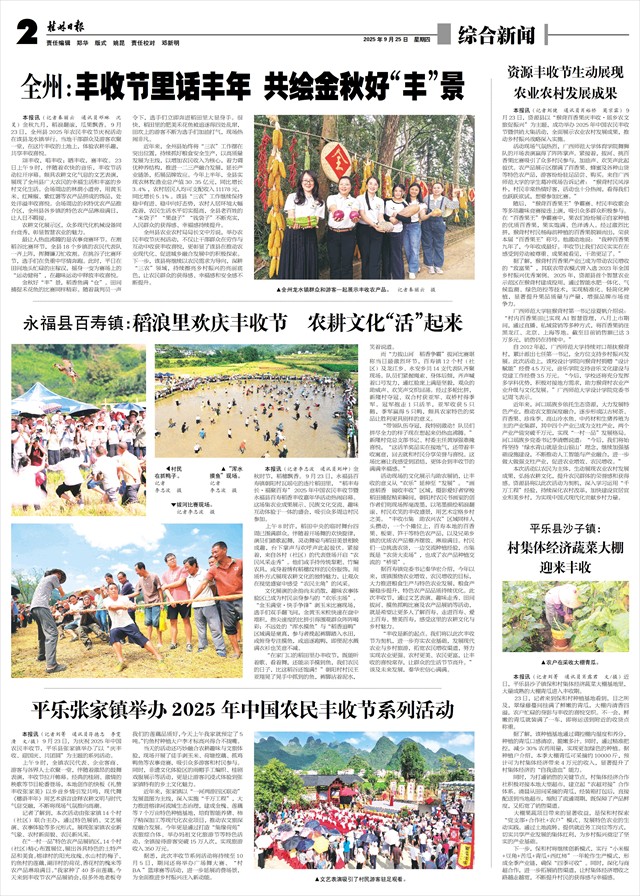 本报讯(记者秦丽云 通讯员邓琳 沈昊)金秋九月,稻浪翻滚,瓜果飘香。9月23日,全州县2025年农民丰收节庆祝活动在该县龙水镇举行。当地干部群众及游客欢聚一堂,在这片丰收的土地上,体验农耕乐趣,共享丰收喜悦。