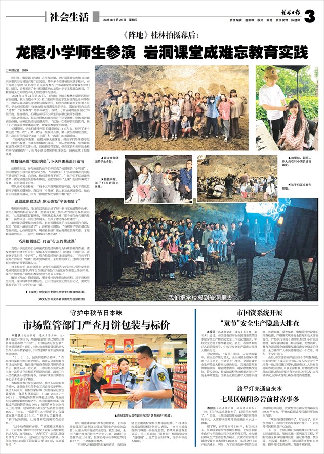 2024年4月24日至25日,《阵地》剧组在桂林七星景区展开密集拍摄,我市龙隐小学30名二至四年级的学生在德育处老师带领下,首次以群众演员身份参与影视创作。据学校德育处相关负责人介绍,学生们在拍摄中饰演战时岩洞课堂里的学生,需在岩洞内完成“逃难”“岩洞教育”等多场戏份。当时,七星岩洞内温度接近20摄氏度,湿度极高,拍摄结束后不少师生的衣服已被汗水浸透。