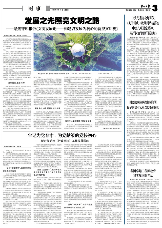 踏上新征程,在以习近平同志为核心的党中央坚强领导下,在习近平新时代中国特色社会主义思想科学指引下,牢记为党育才、为党献策的党校初心,各级党校(行政学院)正踔厉奋发、勇毅前行,以党校(行政学院)事业高质量发展为推进中国式现代化作出新的更大贡献。 (新华社北京9月27日电)