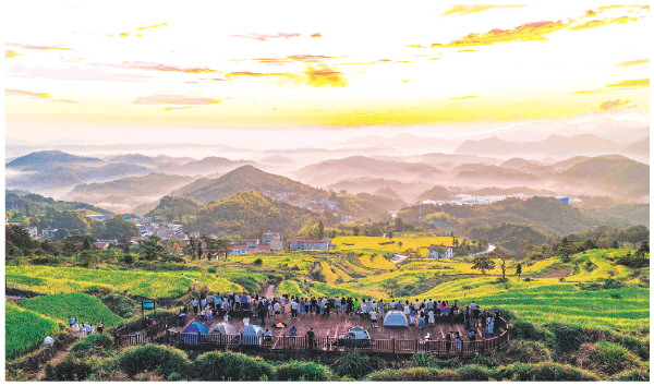 10月4日清晨,游客聚集在浙江省台州市天台县泳溪乡北山村的鎏金梯田观景台拍摄日出。(无人机照片)