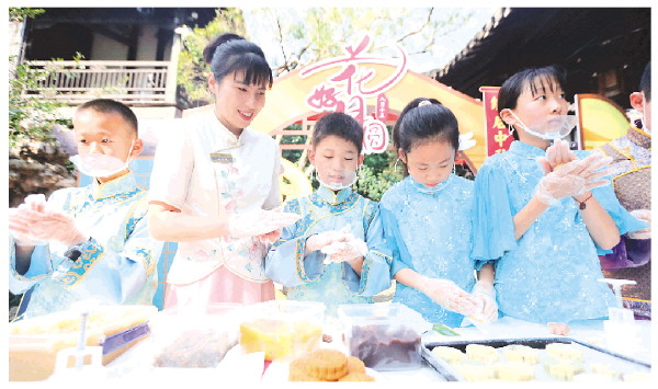 ▲10月6日,在江苏省扬州市何园景区,小朋友们在工作人员的指导下体验制作月饼。