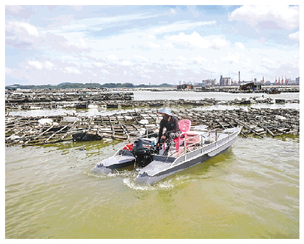 ▲10月7日,钦州市钦南区龙门港镇南村一名村民驾船去修补受损蚝排。