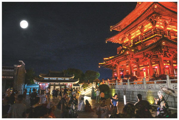 ▲10月6日是中秋佳节,当天晚上在逍遥楼平台上,市民游客一边参观一边赏月,享受美好的假日。(二次曝光) 记者滕嘉 摄