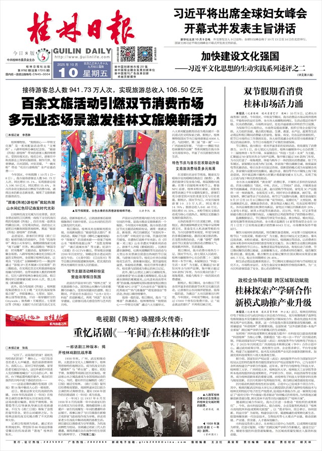 桂林博物馆,“刻骨铭心——甲骨文化展”及一系列配套活动带火“文博热”;八路军桂林办事处纪念馆,“跟着《阵地》游桂林”带来的游客人数持续增长,受到央视关注;桂花公社,游客在中秋夜游会上身穿汉服游园、制作月饼、投壶猜谜,共庆团圆;兴安灵渠,“一碗米粉”带动“吃住行游购娱”全产业链消费……