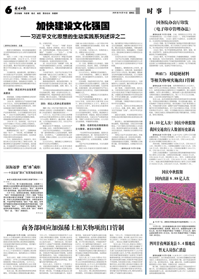 发言人表示,根据《中华人民共和国出口管制法》《中华人民共和国两用物项出口管制条例》等相关法律法规,10月9日,经中国国务院批准,商务部发布2025年第61号公告,对含有中国成分的部分境外稀土相关物项实施出口管制。
