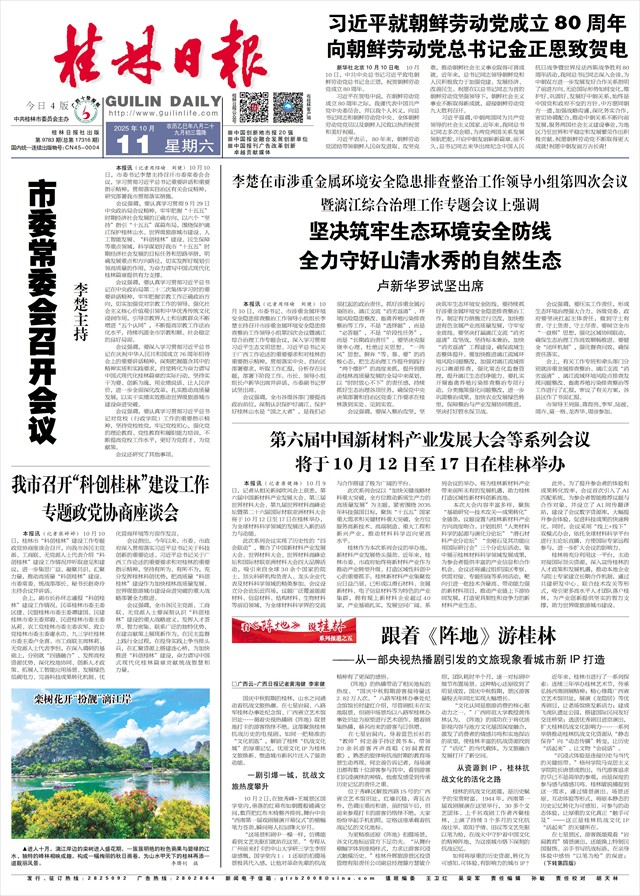 全力守好山清水秀的自然生态 卢新华罗试坚出席   本报讯(记者周绍瑜 刘健)10月10日,市委书记、市涉重金属环境安全隐患排查整治工作领导小组组长李楚主持召开市涉重金属环境安全隐患排查整治工作领导小组第四次会议暨漓江综合治理工作专题会议,深入学习贯彻习近平生态文明思想、习近平总书记关于广西工作论述的重要要求和对桂林的重要指示精神,贯彻落实中央、自治区部署要求,听取工作汇报,分析存在问题,部署下阶段工作。市长、领导小组组长卢新华出席并讲话,市委副书记罗试坚出席。