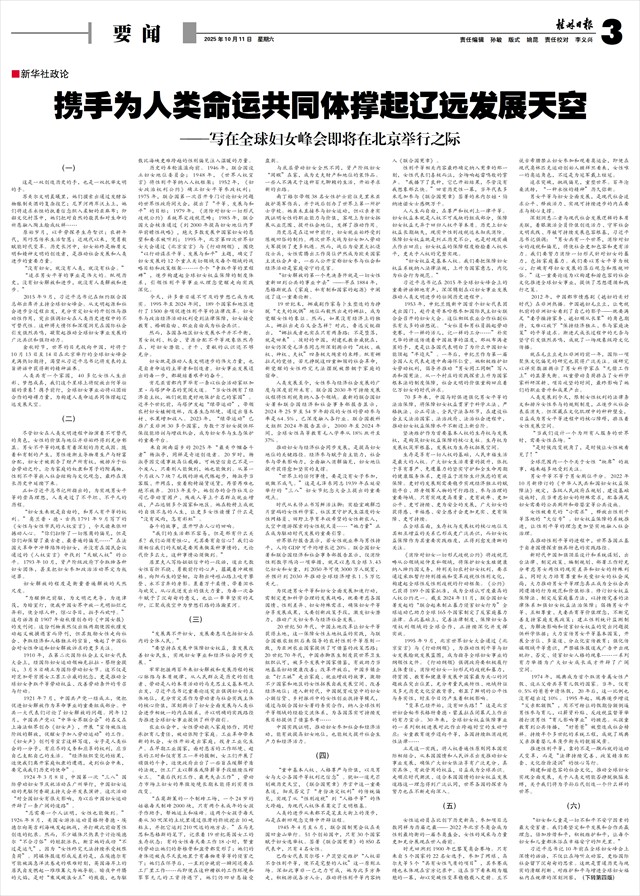 习近平总书记10年前在全球妇女峰会上深情的话语,不仅让在场听众动容,更给国际社会留下沉甸甸的思索。这既是贯通历史与现实的清醒判断、对维护和平与增进全球妇女福祉内在规律的深刻洞察,(下转第四版)