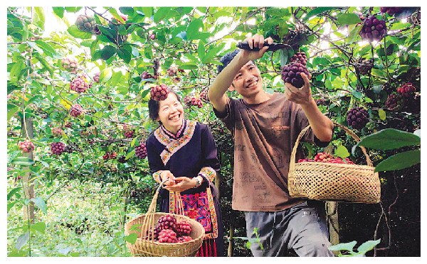 ▲陈通采摘水果“黑老虎”。