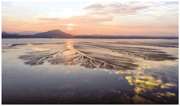 这是在浙江嘉兴海宁拍摄的晨曦映照下的“潮汐树”(10月2日摄,无人机照片)。