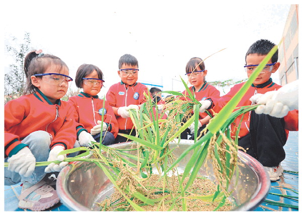 10月15日,云南省曲靖市陆良县大莫古镇中心幼儿园的孩子们在校内劳动基地体验打稻穗。 新华社发