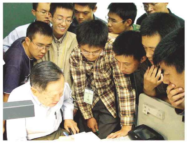 ◤2004年9月,杨振宁在清华大学指导本科生。