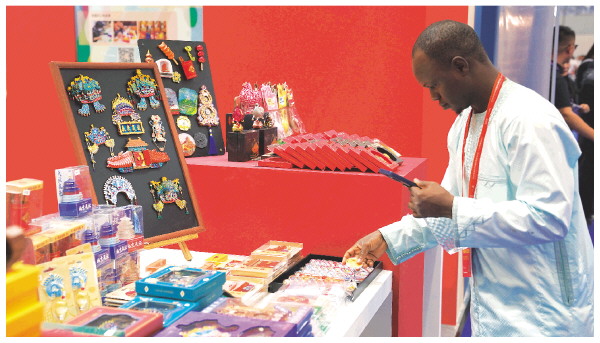 10月18日,参展商在陶瓷博览会展区观看文创产品。