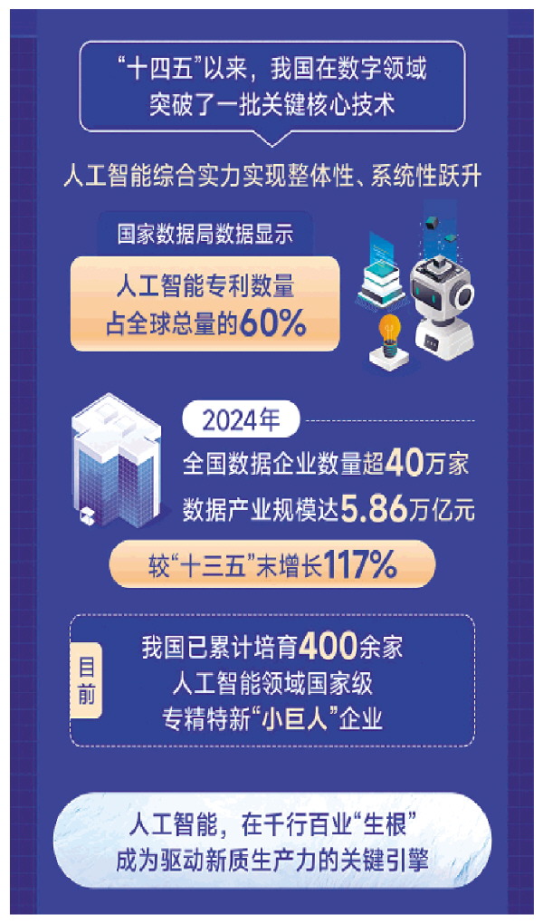 “十四五”以来,我国在数字领域突破了一批关键核心技术。人工智能综合实力实现整体性、系统性跃升,国家数据局数据显示,人工智能专利数量占全球总量的60%。
