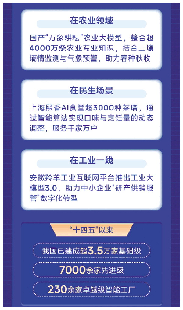在工业一线,安徽羚羊工业互联网平台推出工业大模型3.0,助力中小企业“研产供销服管”数字化转型。“十四五”以来,我国已建成超3.5万家基础级、7000余家先进级、230余家卓越级智能工厂。