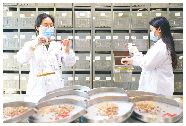 10月22日,江苏省海安市中医院青年中药师在中药房为患者抓药。