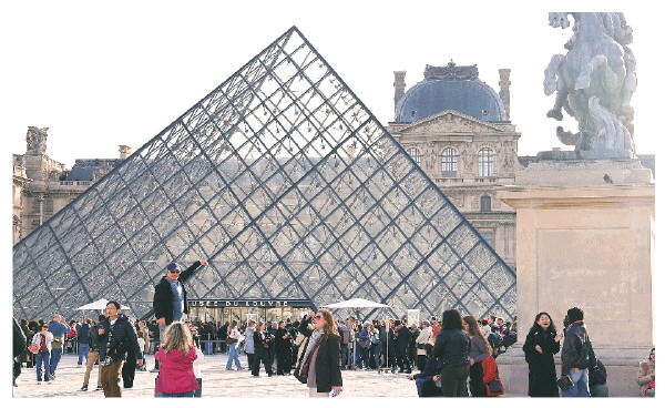 10月22日,在法国巴黎,大量游客聚集在卢浮宫博物馆的玻璃金字塔入口前。
