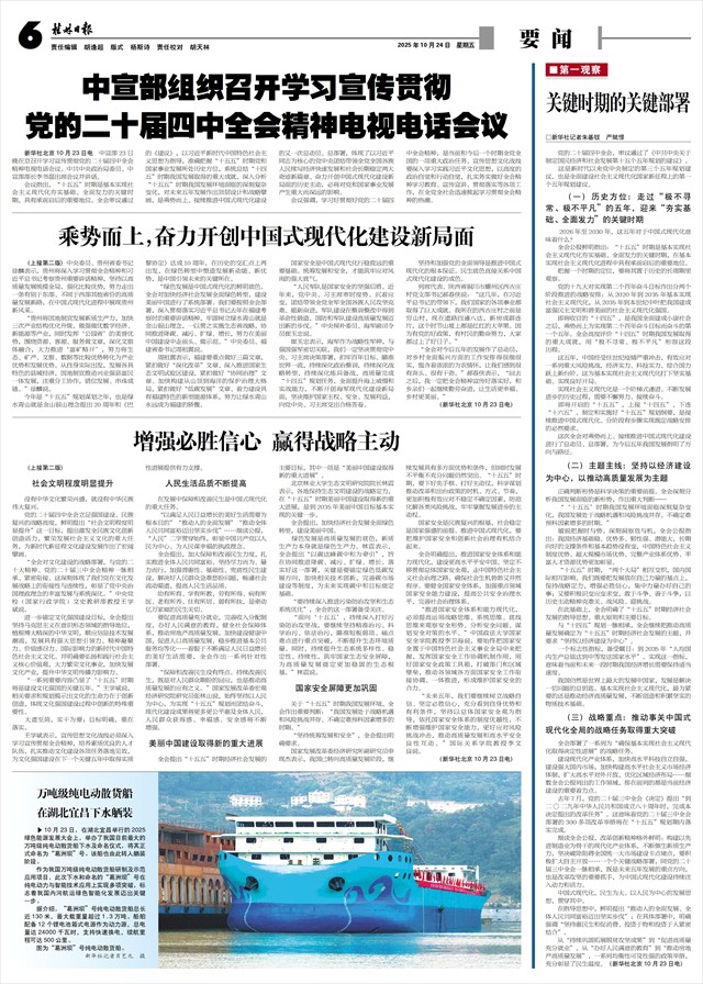 “十五五”时期是基本实现社会主义现代化夯实基础、全面发力的关键时期。全会通过的《建议》,准确把握“十五五”时期党和国家事业发展所处历史方位,深入分析我国发展环境面临的深刻复杂变化,对未来5年发展作出顶层设计和战略擘画。《建议》坚持目标导向和问题导向,坚持系统思维,坚持进一步全面深化改革,坚持扩大对外开放,指导方针科学精准,主要目标清晰明确,任务举措求真务实。这是乘势而上、接续推进中国式现代化建设的又一次总动员、总部署,体现了以习近平同志为核心的党中央团结带领全党全国各族人民续写经济快速发展和社会长期稳定两大奇迹新篇章、奋力开创中国式现代化建设新局面的历史主动,必将对党和国家事业发展产生重大而深远的影响。