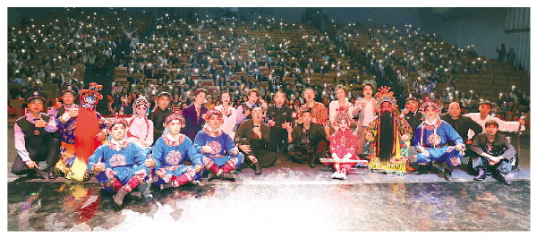 10月24日晚,在桂林大剧院上演精彩的开幕大戏《戏悟》后,演职人员和观众一起合影。 记者李凯 摄