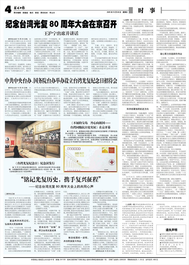 新华社北京10月25日电 纪念台湾光复80周年大会25日在京召开。中共中央政治局常委、全国政协主席王沪宁出席并讲话。他表示,要深入学习贯彻习近平总书记在纪念中国人民抗日战争暨世界反法西斯战争胜利80周年大会上的重要讲话精神,广泛团结凝聚海内外中华儿女,同忆历史、捍卫成果、守护家园、共创未来,共创中华民族绵长福祉,续写中华民族历史新辉煌。