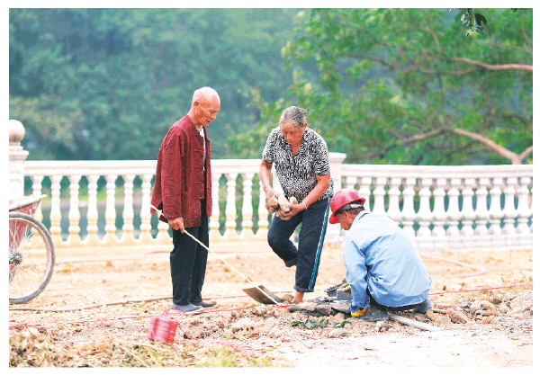 唐以金老人和工人一起干活。 记者李忠波 摄