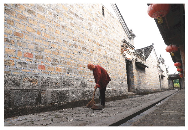 青砖黛瓦的古建筑群静卧于山水绿荫之间,阳光穿过屋瓦缝隙,在地面投下斑驳光影。古建筑旁,一位八旬老人正指挥工人铺设地面,不时俯身亲手调试,神情中透着一股执拗的认真。他,就是倾尽8000余万元家财,耗时16年,让42座明清古民居重获新生的全州村民唐以金。