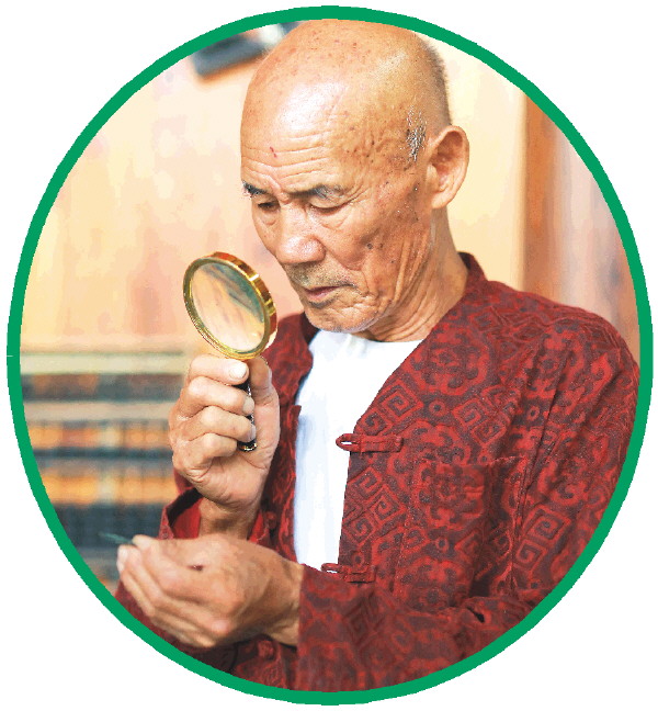 唐以金老人在鉴赏古钱币。记者李忠波 摄